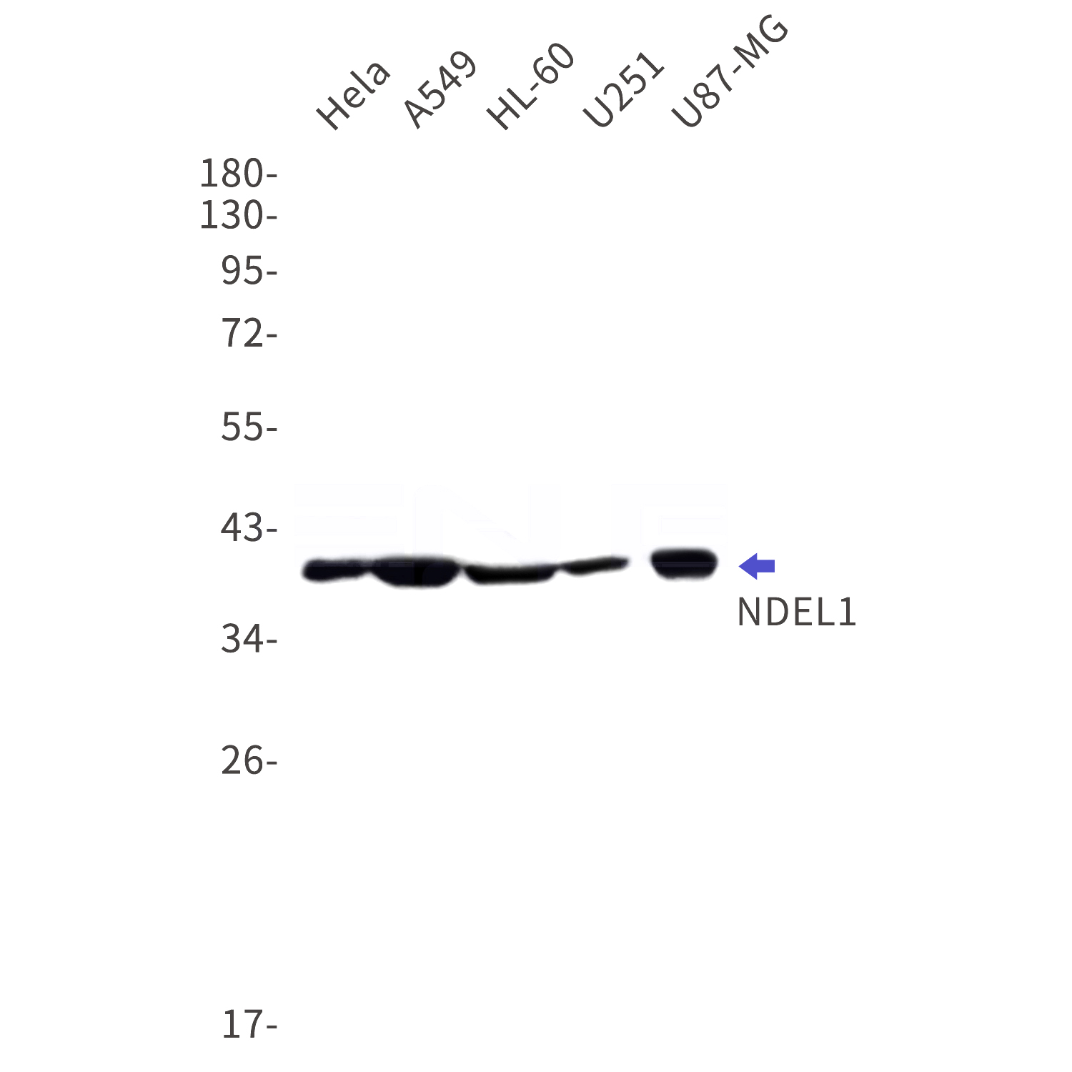 Western blot detection of NDEL1 in Hela,A549,HL-60,U251,U87-MG cell lysates using NDEL1 Rabbit mAb(1:1000 diluted).Predicted band size:38kDa.Observed band size:38kDa.
