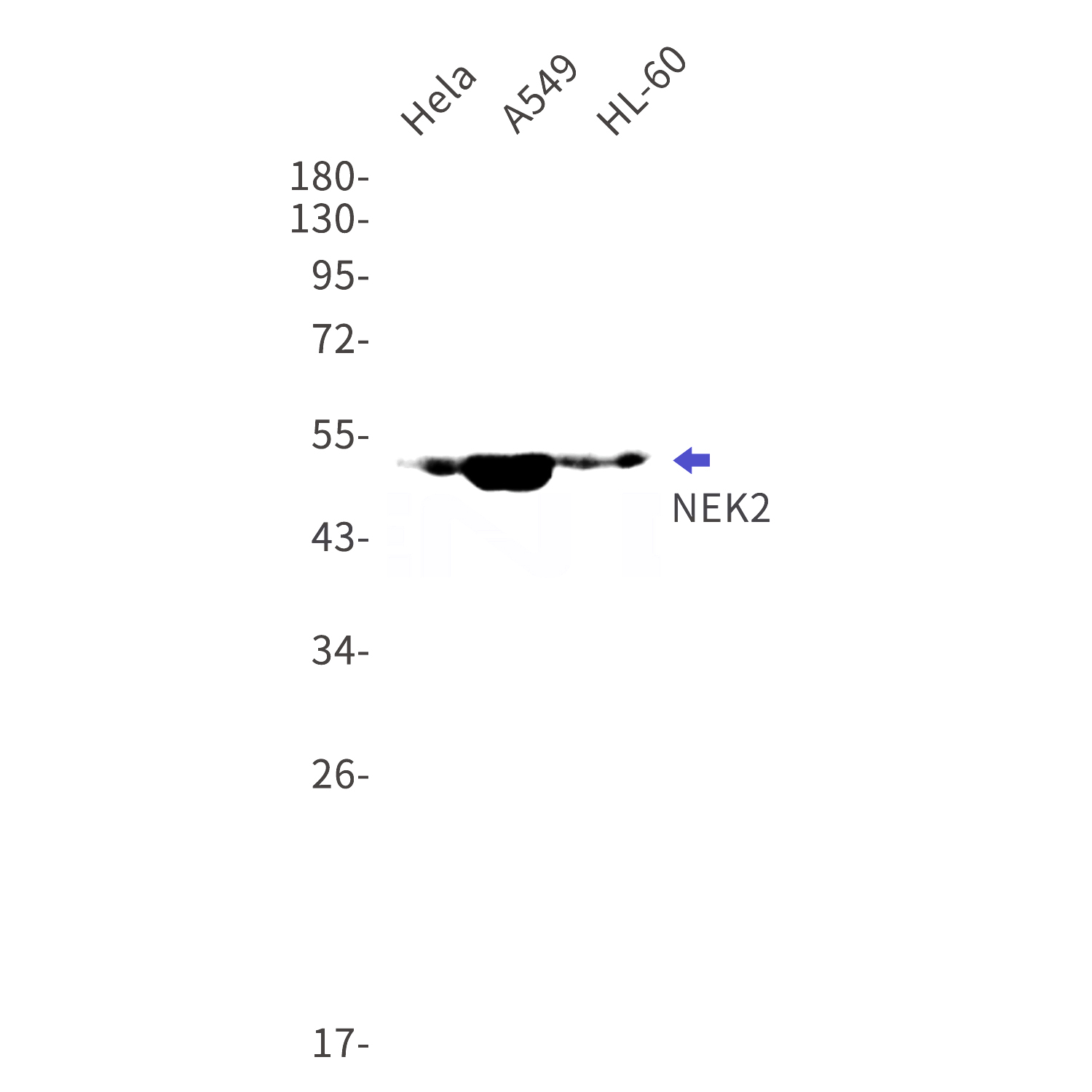 Western blot detection of NEK2 in Hela,A549,HL-60 cell lysates using NEK2 Rabbit mAb(1:1000 diluted).Predicted band size:52kDa.Observed band size:52kDa.