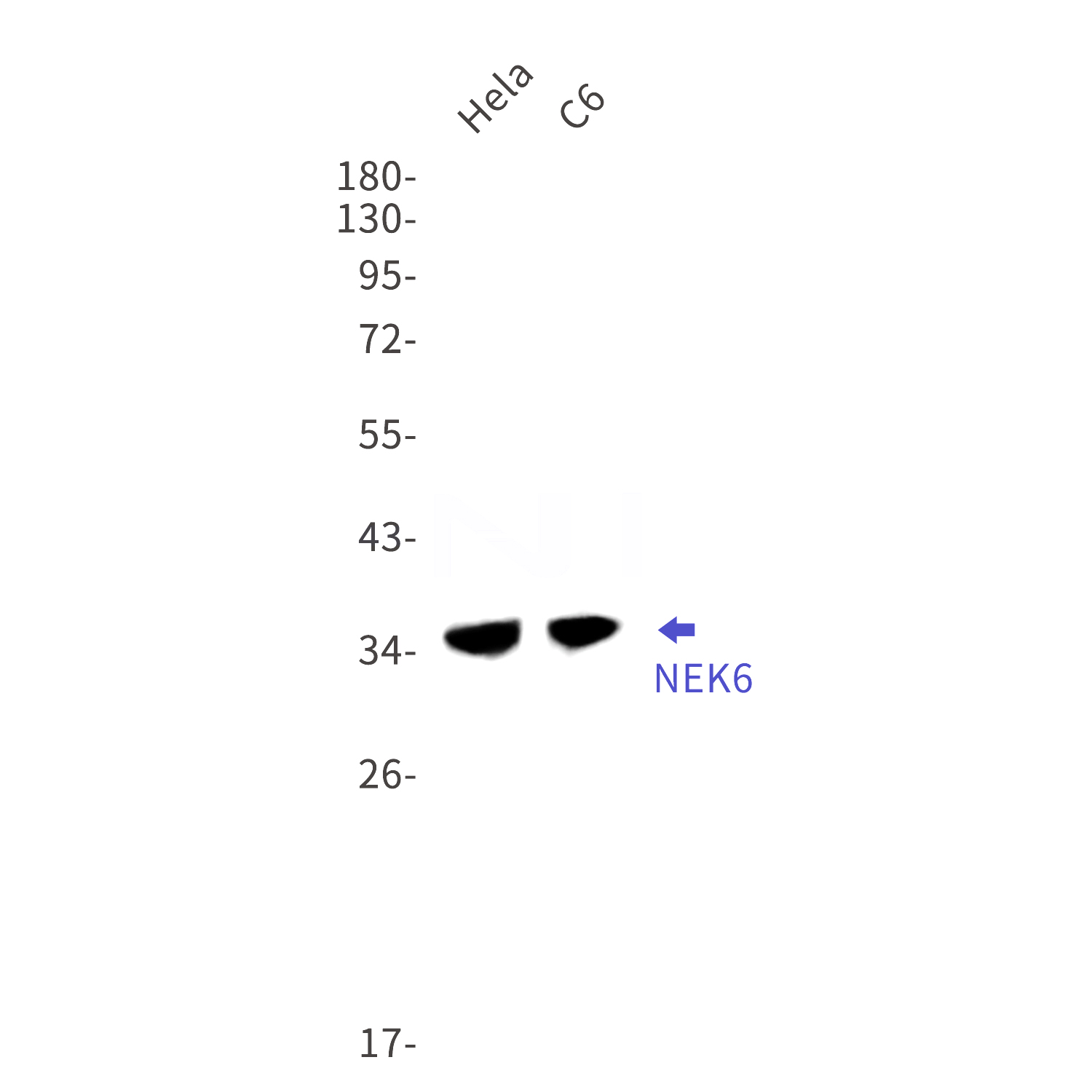 Western blot detection of NEK6 in Hela,C6 cell lysates using NEK6 Rabbit mAb(1:1000 diluted).Predicted band size:36kDa.Observed band size:36kDa.