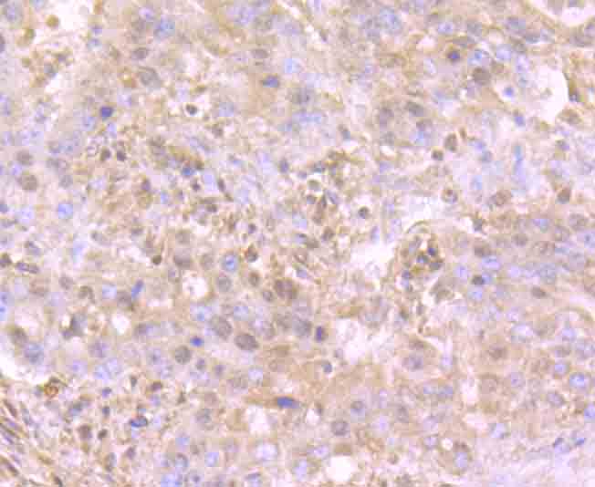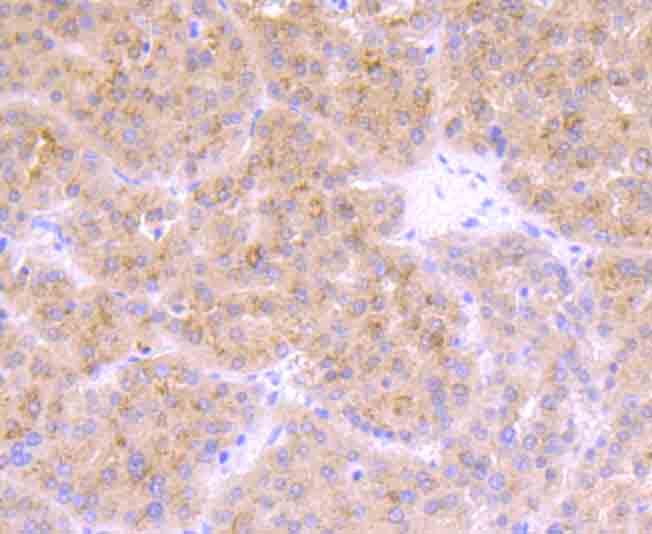 Fig3: Immunohistochemical analysis of paraffin-embedded human liver cancer tissue using anti-TrkA antibody. Counter stained with hematoxylin.