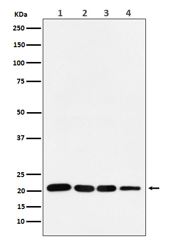 Western blot analysis of p21 in (1) MCF-7 cell lysate; (2) HeLa cell lysate. (3) LnCap cell lysate; (4) U87 MG cell lysate.