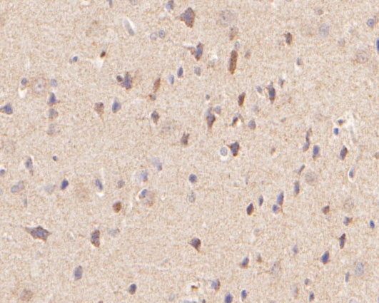 Fig2:; Immunohistochemical analysis of paraffin-embedded mouse brain tissue using anti-P2RX5 antibody. The section was pre-treated using heat mediated antigen retrieval with Tris-EDTA buffer (pH 8.0-8.4) for 20 minutes.The tissues were blocked in 5% BSA for 30 minutes at room temperature, washed with ddH; 2; O and PBS, and then probed with the primary antibody ( 1/200) for 30 minutes at room temperature. The detection was performed using an HRP conjugated compact polymer system. DAB was used as the chromogen. Tissues were counterstained with hematoxylin and mounted with DPX.
