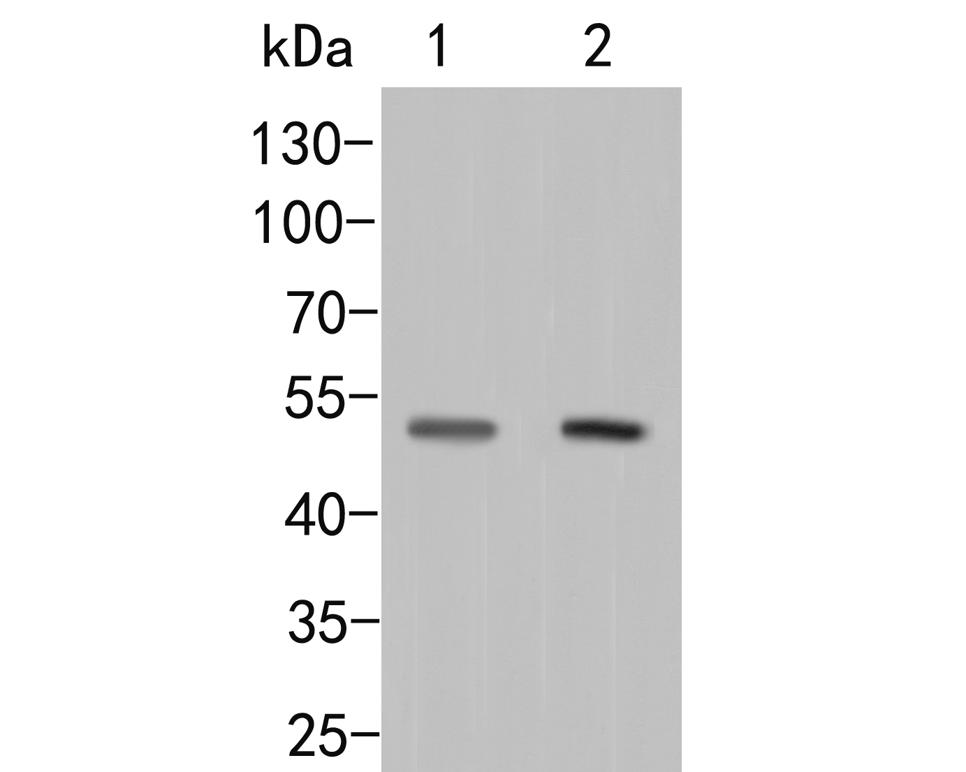 Fig1:; Western blot analysis of P2RX5 on different lysates. Proteins were transferred to a PVDF membrane and blocked with 5% BSA in PBS for 1 hour at room temperature. The primary antibody ( 1/1000) was used in 5% BSA at room temperature for 2 hours. Goat Anti-Rabbit IgG - HRP Secondary Antibody (HA1001) at 1:5,000 dilution was used for 1 hour at room temperature.; Positive control:; Lane 1: Rat brain tissue lysate; Lane 2: Rat heart tissue lysate