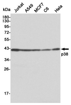 Western blot analysis of extracts from Jurkat,A549,MCF7,C6 and Hela cell lysates using p38 mouse mAb (1:1000 diluted).Predicted band size:41KDa.Observed band size:41KDa.