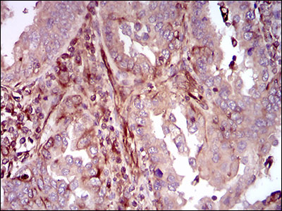 Immunohistochemical analysis of paraffin-embedded endometrial cancer tissues using MAPK14 mouse mAb with DAB staining.