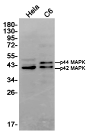 Western blot detection of p44/42 MAPK in Hela,C6 cell lysates using p44/42 MAPK (ERK1/2) (9A4) Mouse mAb(1:1000 diluted).Predicted band size:44/42KDa.Observed band size:44/42KDa.