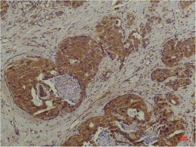 Immunohistochemical analysis of paraffin-embedded Human Breast Carcinoma using P44/42 MAPK (ERK1/2) Mouse mAb diluted at 1:200.