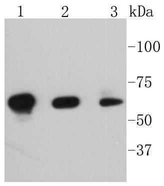 Fig1:; Western blot analysis of Phospho-PAK1(S144)+PAK2(S141)+PAK3(S139) on different lysates. Proteins were transferred to a PVDF membrane and blocked with 5% BSA in PBS for 1 hour at room temperature. The primary antibody ( 1/500) was used in 5% BSA at room temperature for 2 hours. Goat Anti-Rabbit IgG - HRP Secondary Antibody (HA1001) at 1:5,000 dilution was used for 1 hour at room temperature.; Positive control:; Lane 1: Hela cell lysate; Lane 2: NIH/3T3 cell lysate; Lane 2: SH-SY5Y cell lysate