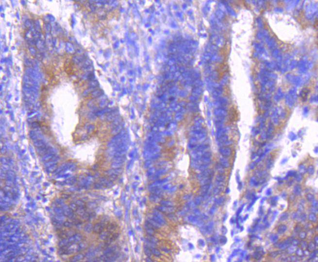 Fig5:; Immunohistochemical analysis of paraffin-embedded human colon carcinoma tissue using anti-Phospho-PAK1(S144)+PAK2(S141)+PAK3(S139) antibody. The section was pre-treated using heat mediated antigen retrieval with Tris-EDTA buffer (pH 8.0-8.4) for 20 minutes.The tissues were blocked in 5% BSA for 30 minutes at room temperature, washed with ddH; 2; O and PBS, and then probed with the primary antibody ( 1/50) for 30 minutes at room temperature. The detection was performed using an HRP conjugated compact polymer system. DAB was used as the chromogen. Tissues were counterstained with hematoxylin and mounted with DPX.