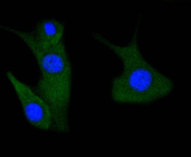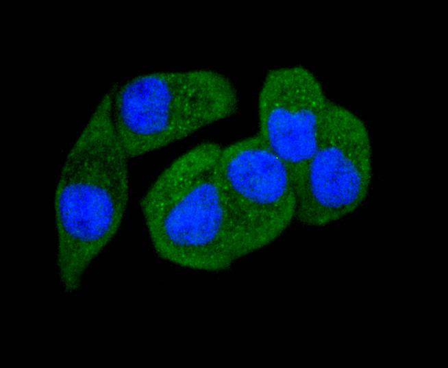 Fig2:; ICC staining of Phospho-PAK1(S144)+PAK2(S141)+PAK3(S139) in Hela cells (green). Formalin fixed cells were permeabilized with 0.1% Triton X-100 in TBS for 10 minutes at room temperature and blocked with 1% Blocker BSA for 15 minutes at room temperature. Cells were probed with the primary antibody ( 1/50) for 1 hour at room temperature, washed with PBS. Alexa Fluor®488 Goat anti-Rabbit IgG was used as the secondary antibody at 1/1,000 dilution. The nuclear counter stain is DAPI (blue).