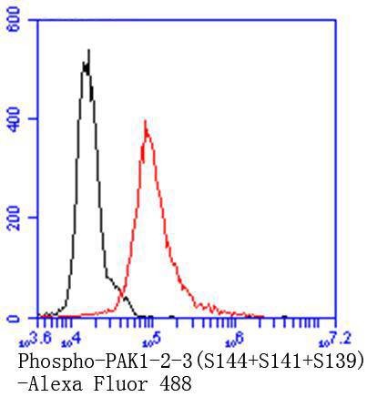 Fig7:; Flow cytometric analysis of Phospho-PAK1(S144)+PAK2(S141)+PAK3(S139) was done on NIH/3T3 cells. The cells were fixed, permeabilized and stained with the primary antibody ( 1/50) (red). After incubation of the primary antibody at room temperature for an hour, the cells were stained with a Alexa Fluor 488-conjugated Goat anti-Rabbit IgG Secondary antibody at 1/1000 dilution for 30 minutes.Unlabelled sample was used as a control (cells without incubation with primary antibody; black).