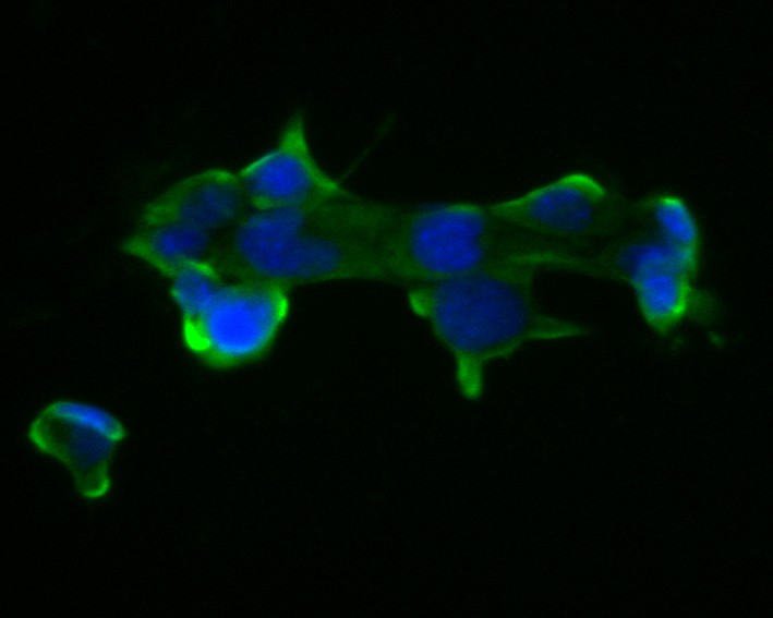 Fig2:; ICC staining of PAK3 in F9 cells (green). Formalin fixed cells were permeabilized with 0.1% Triton X-100 in TBS for 10 minutes at room temperature and blocked with 1% Blocker BSA for 15 minutes at room temperature. Cells were probed with the primary antibody ( 1/50) for 1 hour at room temperature, washed with PBS. Alexa Fluor®488 Goat anti-Rabbit IgG was used as the secondary antibody at 1/1,000 dilution. The nuclear counter stain is DAPI (blue).