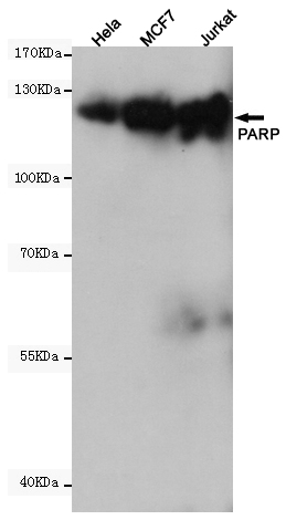 Western blot analysis of extracts from Hela,MCF7 and Jurkat cell lysates using PARP (10C2) Mouse mAb (1:2000 diluted).Predicted band size:116, 89KDa.Observed band size:116KDa.
