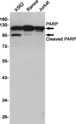 Western blot detection of PARP in K562,Ramos,Jurkat cell lysates using PARP (10C2) Mouse mAb(1:1000 diluted).Predicted band size:116KDa.Observed band size:116/89KDa.