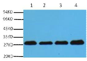 Western blot analysis of Hela (1), Rat brain (2), NIH 3T3 (3), 293T (4), diluted at 1:5000.