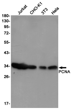 Western blot detection of PCNA in Jurkat,CHO-K1,3T3,Hela cell lysates using PCNA (9C9) Mouse mAb(1:1000 diluted).Predicted band size:29KDa.Observed band size:34KDa.