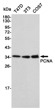 Western blot detection of PCNA in T47D,3T3 and COS7 cell lysates using PCNA mouse mAb (1:1000 diluted).Predicted band size:36KDa.Observed band size:36KDa.