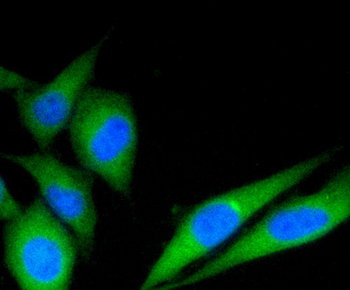 Fig4: ICC staining C19orf35 in PC-3M cells (green). The nuclear counter stain is DAPI (blue). Cells were fixed in paraformaldehyde, permeabilised with 0.25% Triton X100/PBS.