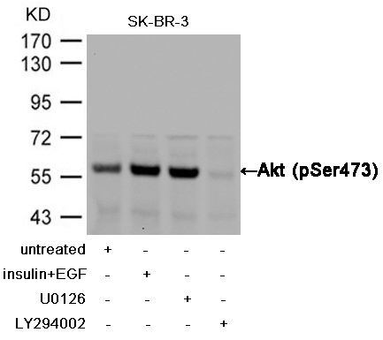 Western blot analysis of extracts from SK-BR-3 cells, treated with insulin and EGF, and pretreated with U0126 and LY294002 cells using Akt (Phospho-Ser473) Antibody .