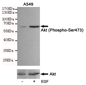Western blot analysis of extracts from A549 cells, untreated or treated with EGF(10ng/ml,10min), using Akt (Phospho-Ser473) Rabbit pAb (167146,1:500 diluted upper) and AKT(pan) Mouse mAb (200323,lower).
