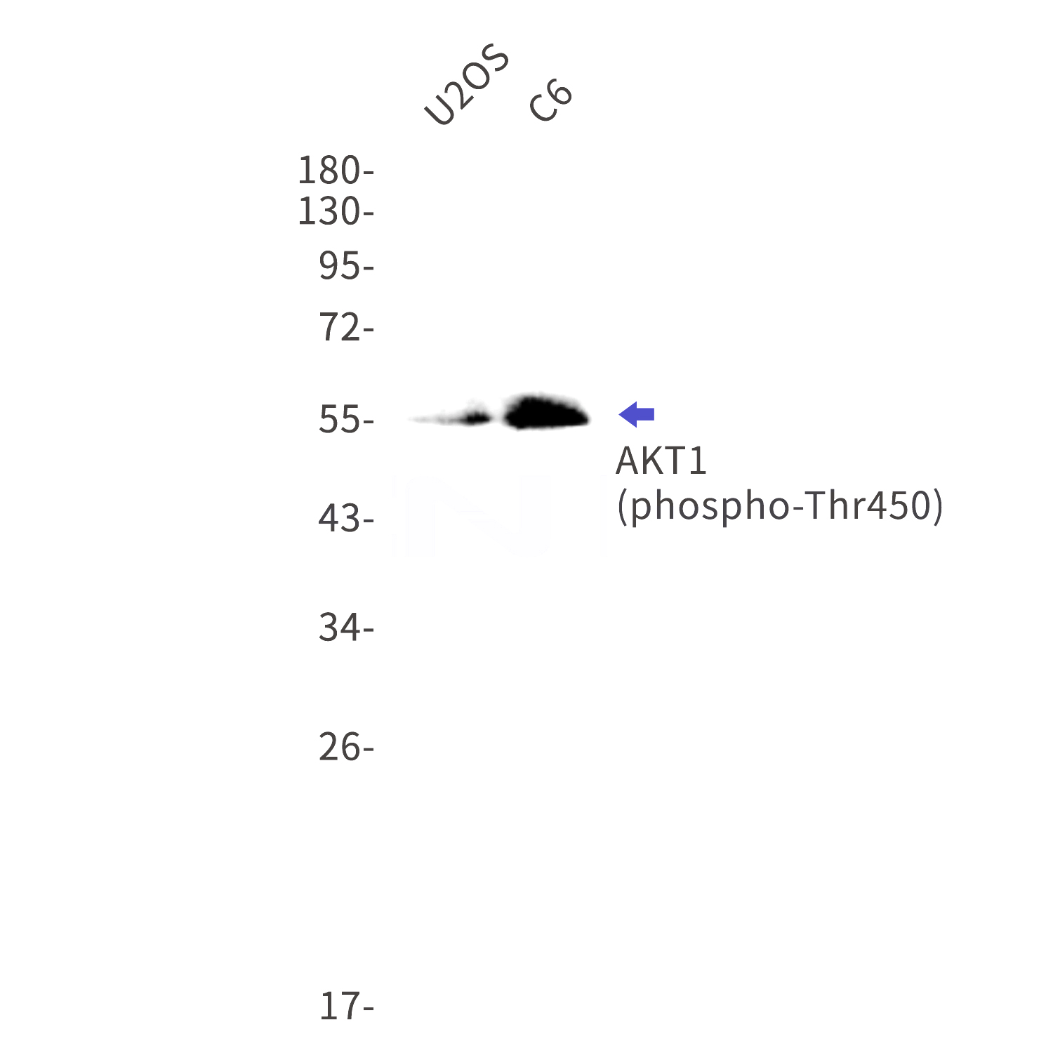 Western blot detection of phospho-AKT1 (Thr450) in U2OS,C6 cell lysates using phospho-AKT1(Thr450) Rabbit mAb(1:1000 diluted).Predicted band size:56kDa.Observed band size:56kDa.