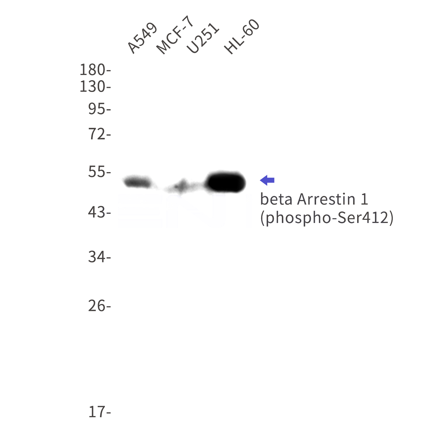 Western blot detection of phospho-beta Arrestin 1 (Ser412) in A549,MCF-7,U251,HL-60 cell lysates using phospho-beta Arrestin 1 (Ser412) Rabbit mAb(1:1000 diluted).Predicted band size:50kDa.Observed band size:50kDa.