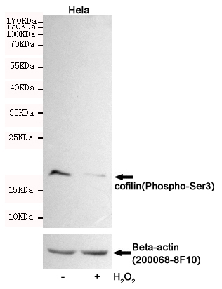 Western blot detection of cofilin(Phospho-Ser3) in Hela cells untreated or treated with H2O2 using cofilin(Phospho-Ser3) Rabbit pAb (dilution 1:500, upper) or u03b2-Actin Mouse mAb (200068-8F10, lower).Predicted band size:19kDa.Observed band size:19kDa.