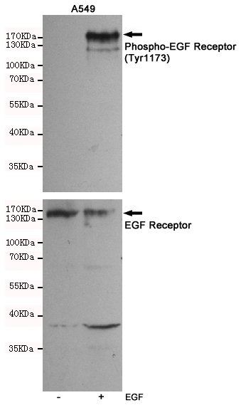Western blot analysis of extracts of A549 cells, untreated or EGF-stimulated, using Phospho-EGF Receptor (Tyr1173) Rabbit pAb (upper,1:500 diluted) and EGF Receptor Antibody 201012-6H11 (lower,1:500 diluted).