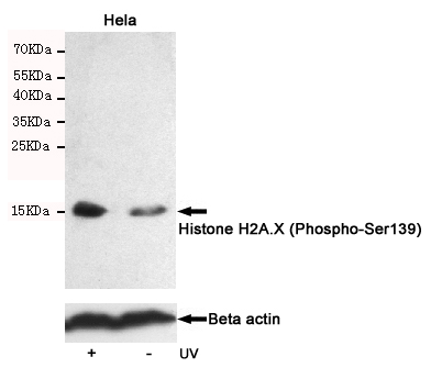 Western blot analysis of extracts from Hela cells, untreated or treated with UV, using Histone H2A.X (Phospho-Ser139) Rabbit pAb (166716,1:500 diluted,upper) or Beta actin Mouse mAb (200068-8F10,lower).