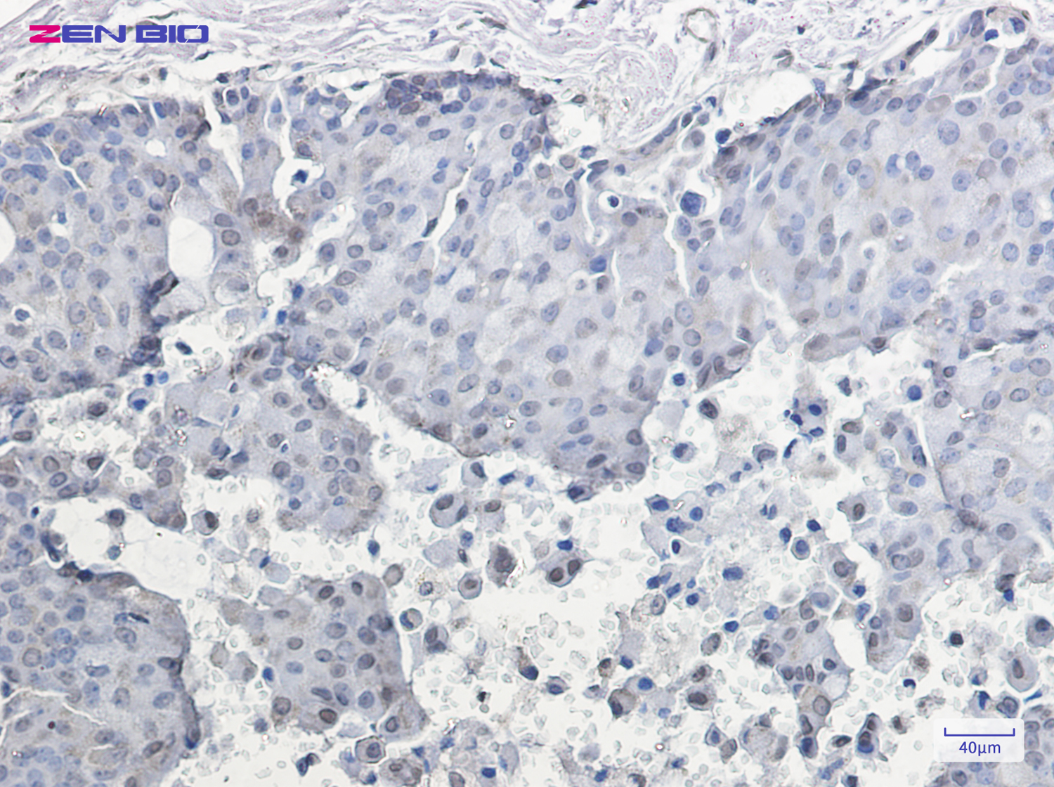 Immunohistochemistry of HSF1 (Phospho-Ser326) in paraffin-embedded Human breast cancer tissue using HSF1 (Phospho-Ser326) Rabbit pAb at dilution 1/20