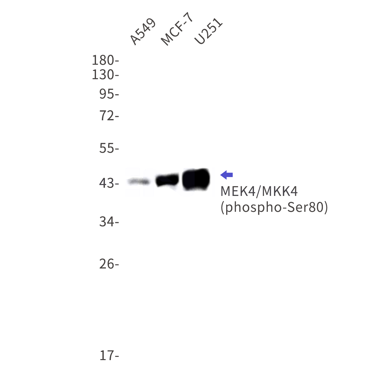 Western blot detection of phospho-MEK4/MKK4 (Ser80) in A549,MCF-7,U251 cell lysates using phospho-MEK4/MKK4 (Ser80) Rabbit mAb(1:1000 diluted).Predicted band size:44kDa.Observed band size:44kDa.