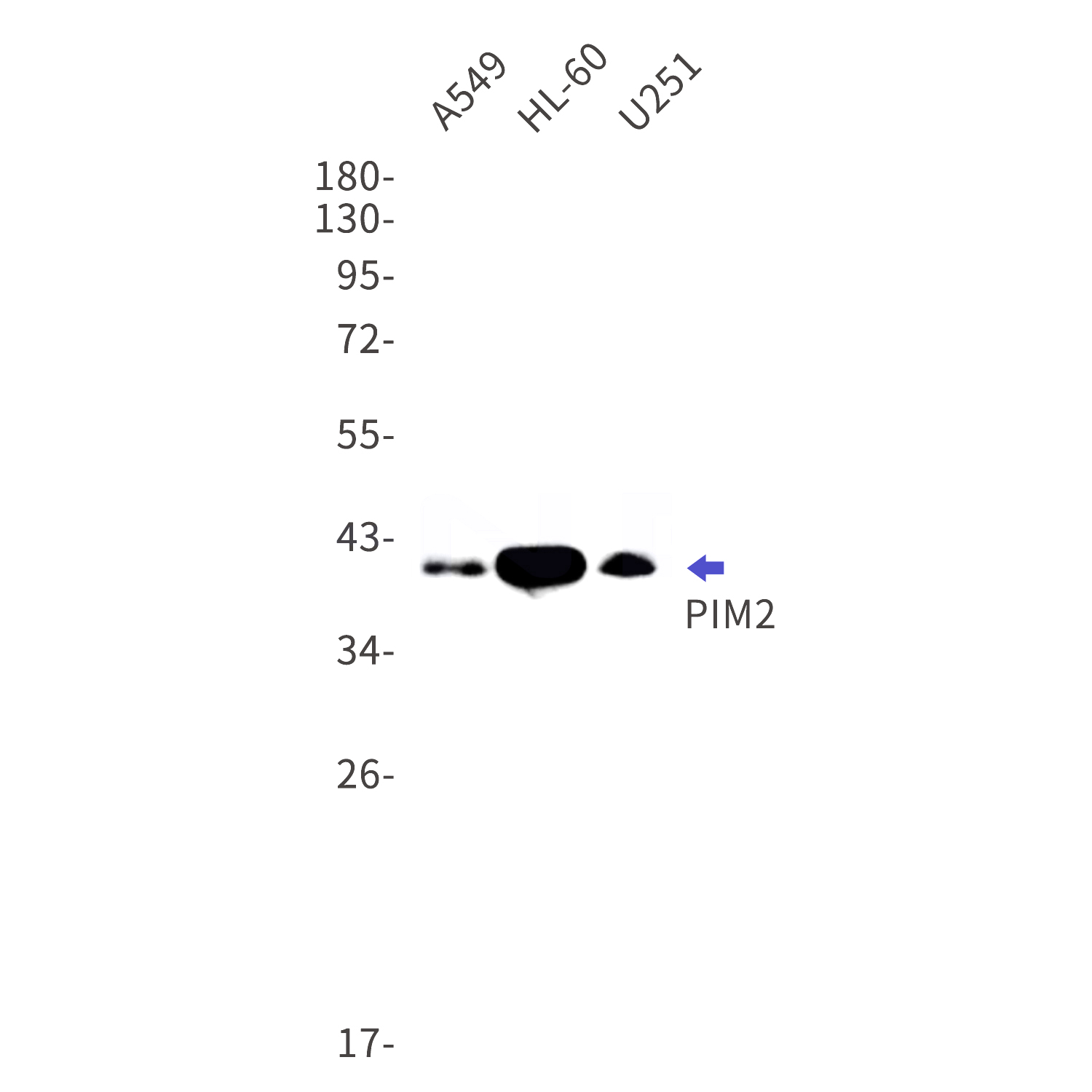 Western blot detection of PIM2 in A549,HL-60,U251 cell lysates using PIM2 Rabbit mAb(1:1000 diluted).Predicted band size:34kDa.Observed band size:40,38,34kDa.
