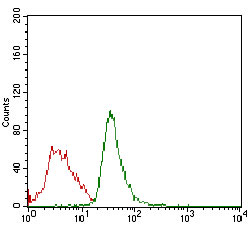 Flow cytometric analysis of Jurkat cells using RB1 mouse mAb (green) and negative control (red).