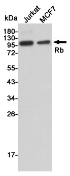 Western blot detection of Rb in Jurkat and MCF7 cell lysates using Rb mouse mAb (1:2000 diluted).Predicted band size:106KDa.Observed band size:110KDa.