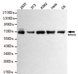 Western blot detection of RPA70 in Hela,293T,C6,3T3 and K562 cell lysates using RPA70 mouse mAb (1:1000 diluted).Predicted band size:70KDa.Observed band size:70KDa.