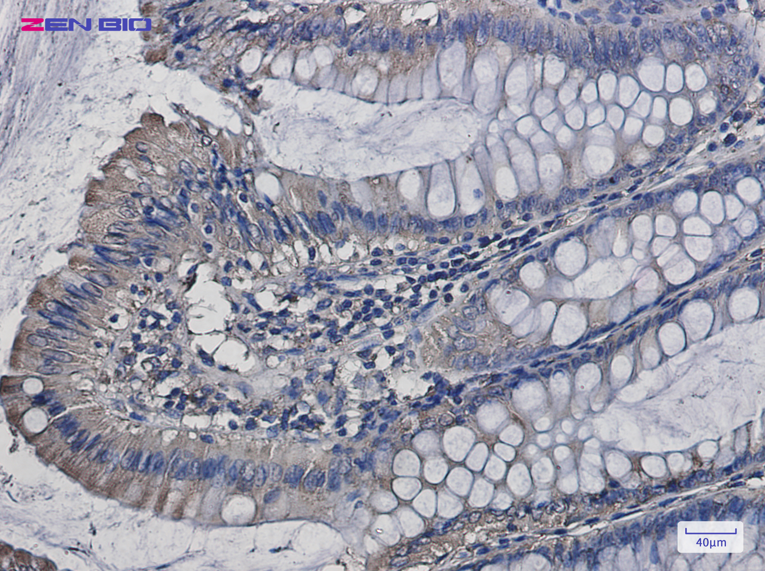 Immunohistochemistry of SERCA2 ATPase in paraffin-embedded Human colon cancer tissue using SERCA2 ATPase Rabbit pAb at dilution 1/50