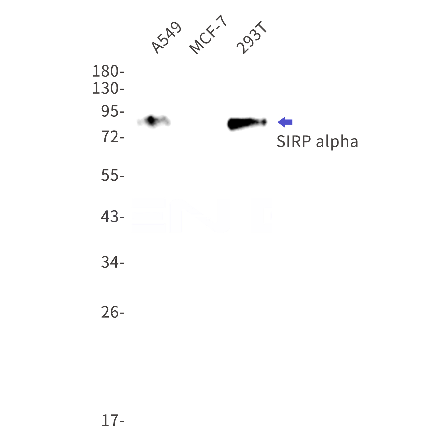 Western blot detection of SIRP alpha in A549,MCF-7,293T cell lysates using SIRP alpha Rabbit mAb(1:1000 diluted).Predicted band size:55kDa.Observed band size:85kDa.