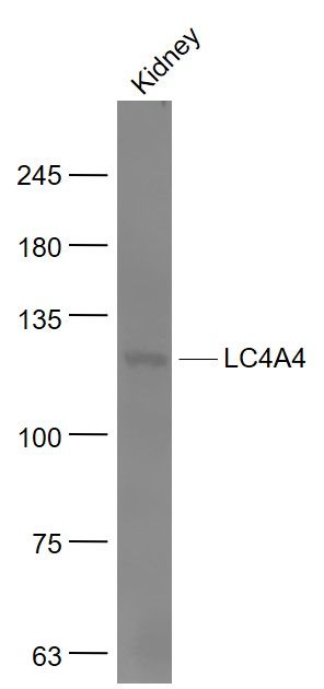 Fig1: Sample:; Kidney (Mouse) Lysate at 40 ug; Primary: Anti- SLC4A4 at 1/1000 dilution; Secondary: IRDye800CW Goat Anti-Rabbit IgG at 1/20000 dilution; Predicted band size: 116 kD; Observed band size: 116 kD