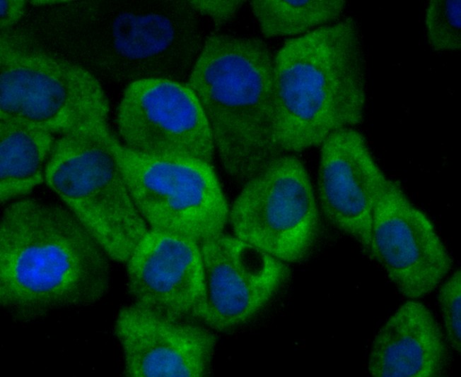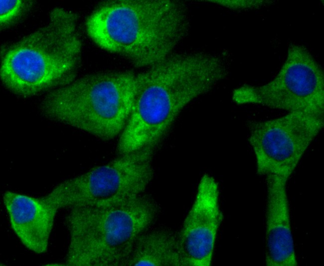 Fig2: ICC staining CD137 (green) in A431 cells. The nuclear counter stain is DAPI (blue). Cells were fixed in paraformaldehyde, permeabilised with 0.25% Triton X100/PBS.