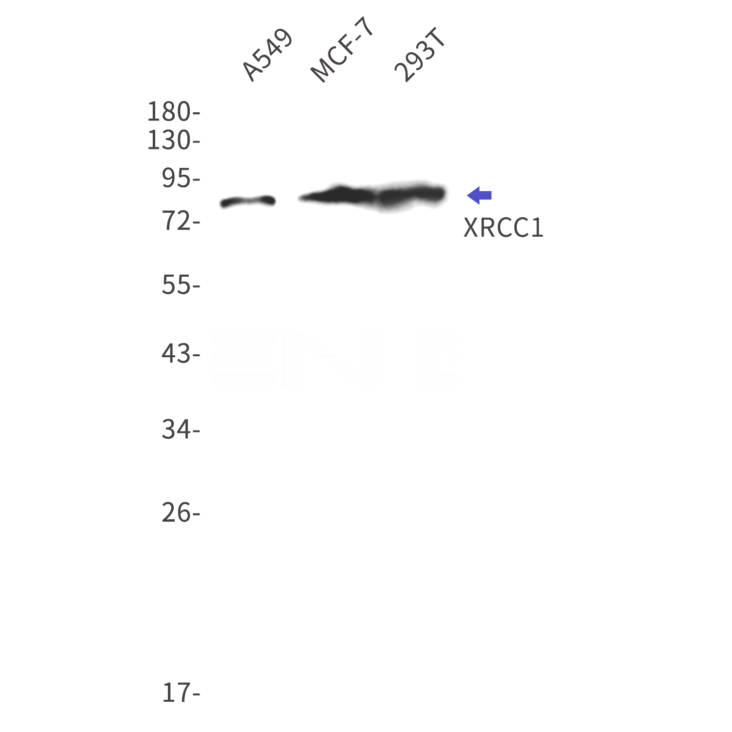 Western blot detection of XRCC1 in A549,MCF-7,293T cell lysates using XRCC1 Rabbit mAb(1:1000 diluted).Predicted band size:70kDa.Observed band size:82kDa.