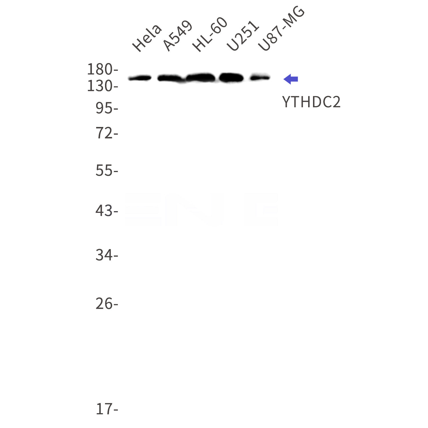 Western blot detection of YTHDC2 in Hela,A549,HL-60,U251,U87-MG cell lysates using YTHDC2 Rabbit mAb(1:1000 diluted).Predicted band size:160kDa.Observed band size:160kDa.