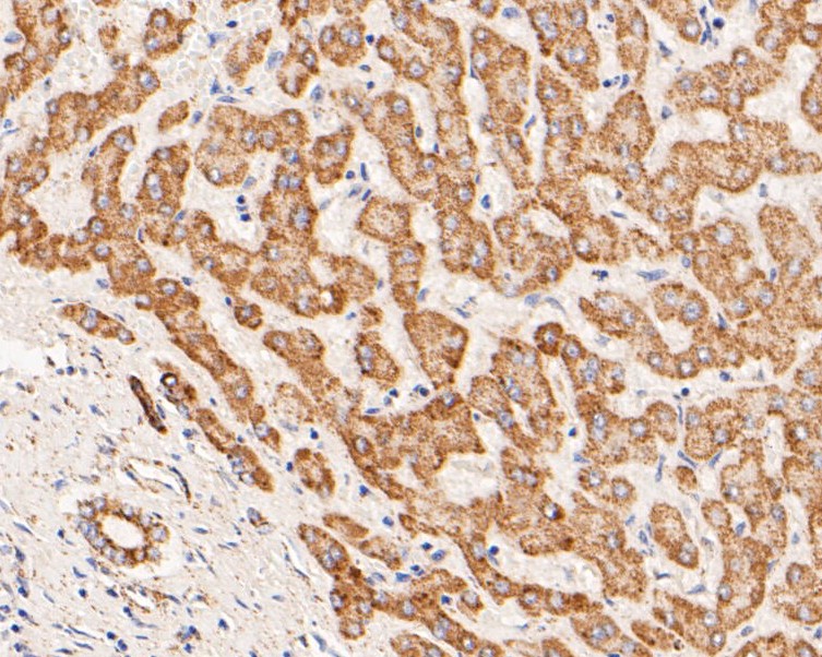 Fig5: Immunohistochemical analysis of paraffin-embedded human liver tissue using anti-ZAC antibody. The section was pre-treated using heat mediated antigen retrieval with Tris-EDTA buffer (pH 8.0-8.4) for 20 minutes.The tissues were blocked in 5% BSA for 30 minutes at room temperature, washed with ddH2O and PBS, and then probed with the primary antibody ( 1/200) for 30 minutes at room temperature. The detection was performed using an HRP conjugated compact polymer system. DAB was used as the chromogen. Tissues were counterstained with hematoxylin and mounted with DPX.