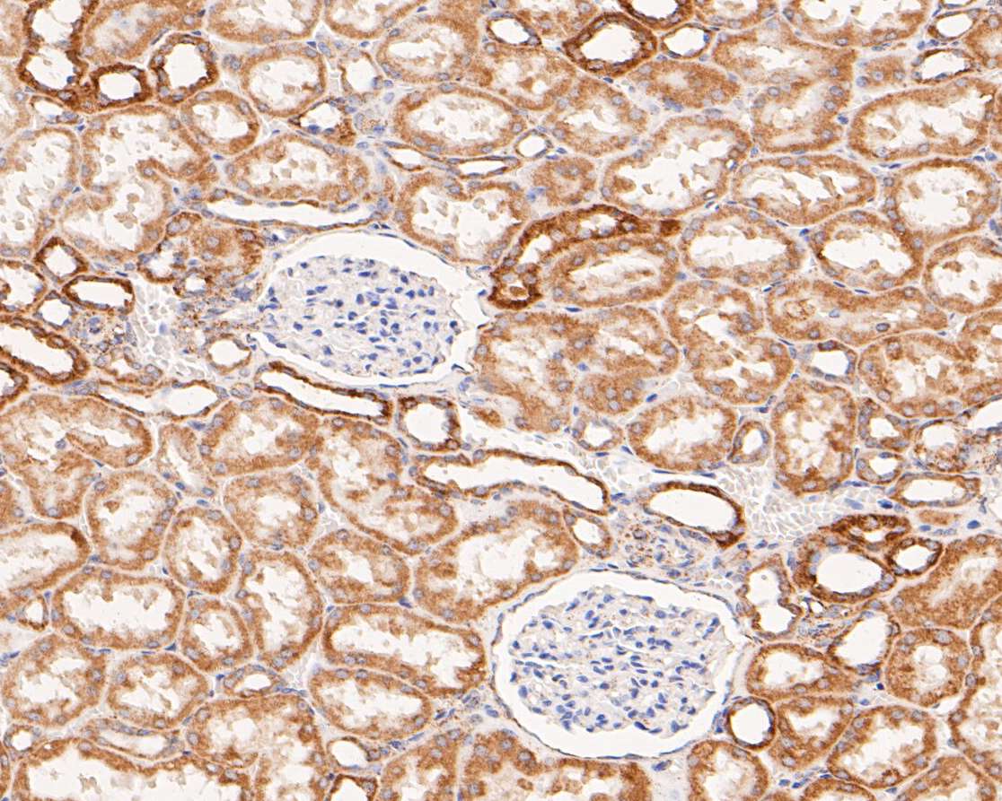 Fig6: Immunohistochemical analysis of paraffin-embedded human kidney tissue using anti-ZAC antibody. The section was pre-treated using heat mediated antigen retrieval with Tris-EDTA buffer (pH 8.0-8.4) for 20 minutes.The tissues were blocked in 5% BSA for 30 minutes at room temperature, washed with ddH2O and PBS, and then probed with the primary antibody ( 1/200) for 30 minutes at room temperature. The detection was performed using an HRP conjugated compact polymer system. DAB was used as the chromogen. Tissues were counterstained with hematoxylin and mounted with DPX.