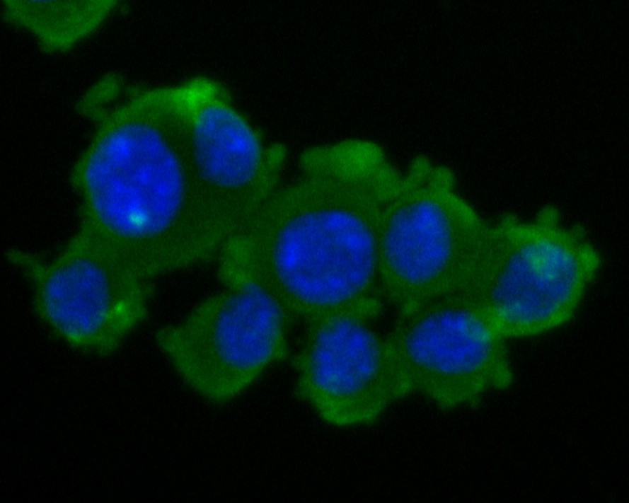 Fig2: ICC staining of ZAC in N2A cells (green). Formalin fixed cells were permeabilized with 0.1% Triton X-100 in TBS for 10 minutes at room temperature and blocked with 1% Blocker BSA for 15 minutes at room temperature. Cells were probed with the primary antibody ( 1/200) for 1 hour at room temperature, washed with PBS. Alexa Fluor®488 Goat anti-Rabbit IgG was used as the secondary antibody at 1/1,000 dilution. The nuclear counter stain is DAPI (blue).