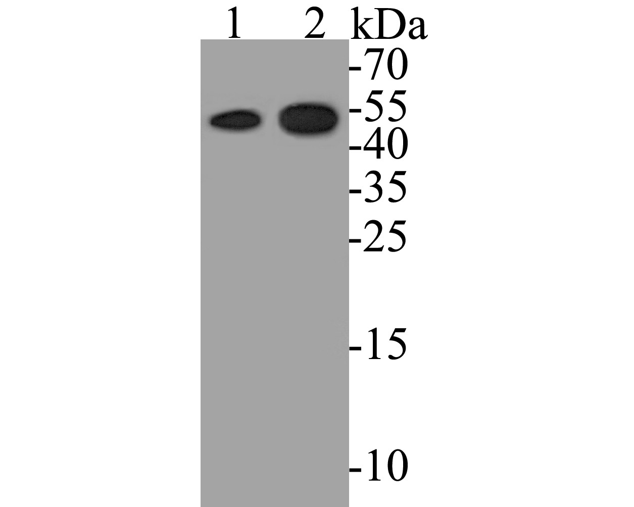 Fig1: Western blot analysis of ZAC on different lysates. Proteins were transferred to a PVDF membrane and blocked with 5% BSA in PBS for 1 hour at room temperature. The primary antibody ( 1/500) was used in 5% BSA at room temperature for 2 hours. Goat Anti-Rabbit IgG - HRP Secondary Antibody (HA1001) at 1:5,000 dilution was used for 1 hour at room temperature.; Positive control:; Lane 1: human kidney tissue lysate; Lane 2: HepG2 cell lysate