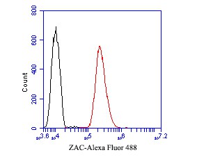 Fig8: Flow cytometric analysis of ZAC was done on SH-SY5Y cells. The cells were fixed, permeabilized and stained with the primary antibody ( 1/50) (red). After incubation of the primary antibody at room temperature for an hour, the cells were st