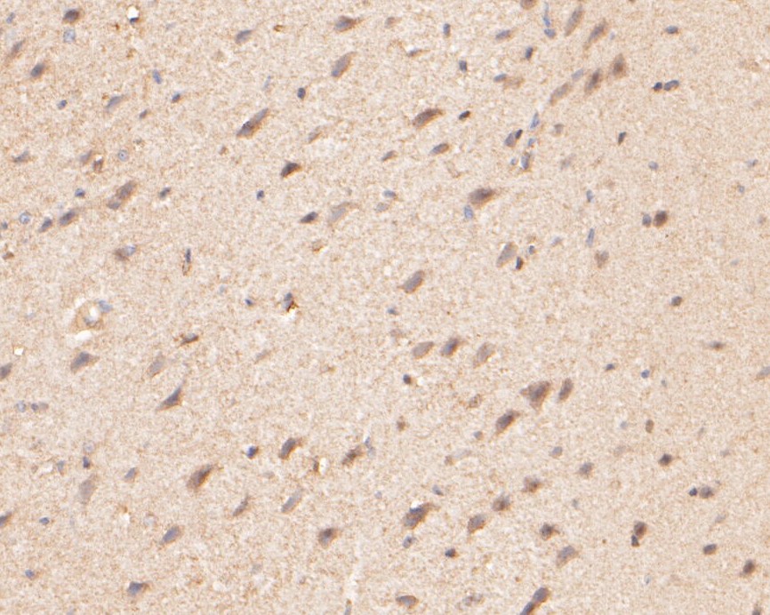 Fig4: Immunohistochemical analysis of paraffin-embedded rat brain tissue using anti-ZAC antibody. The section was pre-treated using heat mediated antigen retrieval with Tris-EDTA buffer (pH 8.0-8.4) for 20 minutes.The tissues were blocked in 5% BSA for 30 minutes at room temperature, washed with ddH2O and PBS, and then probed with the primary antibody ( 1/200) for 30 minutes at room temperature. The detection was performed using an HRP conjugated compact polymer system. DAB was used as the chromogen. Tissues were counterstained with hematoxylin and mounted with DPX.
