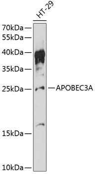 Western blot analysis of extracts of HT-29 cells, using APOBEC3A antibody at 1:3000 dilution.Secondary antibody: HRP Goat Anti-Rabbit IgG (H+L) at 1:10000 dilution.Lysates/proteins: 25ug per lane.Blocking buffer: 3% nonfat dry milk in TBST.Detection: ECL Basic Kit .Exposure time: 90s.