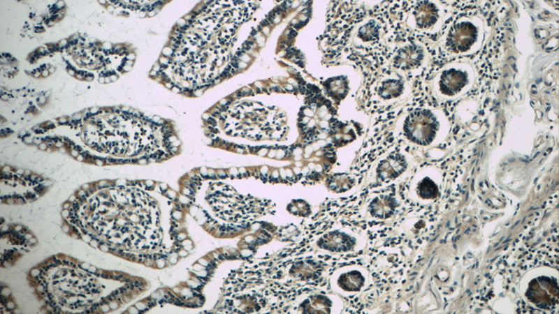 Immunohistochemistry of paraffin-embedded human small intestine tissue slide using Catalog No:108242(ARF1 Antibody) at dilution of 1:50 (under 10x lens)