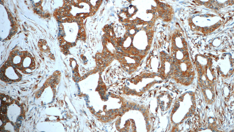 Immunohistochemistry of paraffin-embedded human breast cancer tissue slide using Catalog No:108252(ARFGAP3 Antibody) at dilution of 1:50 (under 10x lens)